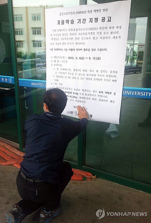 | △ 충북 모 대학, 메르스 우려 휴업…도내 첫 사례 (청주=연합뉴스) 전창해 기자 = 충북의 한 대학교 관계자가 5일 중동호흡기증후군(메르스) 예방차원에서 휴업에 들어간다는 내용의 안내문을 학내 건물에 붙이고 있다. 이 대학은 이날부터 오는 12일까지 휴업한다. 도내 대학으로는 첫 휴업 사례다. 2015.6.5 jeonch@yna.co.kr |