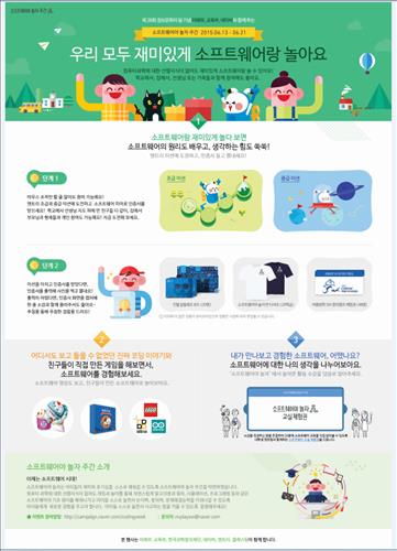 (서울=연합뉴스) 양정우 기자 = 미래창조과학부는 '6월 정보문화의 달'을 맞아 15∼21일 소프트웨어(SW) 프로그래밍의 개념 등을 배울 수 있는 온라인 '소프트웨어야, 놀자!(http://campaign.naver.com/codingweek)'를 운영한다고 7일 밝혔다.