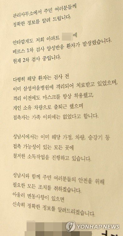 | △ "주민 여러분들께 정확한 정보를 알려 드립니다" (성남=연합뉴스) 이우성 기자 = 성남시가 지난 6일 지역에서 중동호흡기증후군(메르스) 1차 양성 판정자가 발생했다며 거주지와 직업 등의 실명을 공개한 다음날인 7일 해당 아파트 관리사무소가 각동 1층 게시판마다 메르스 관련 정보 안내문을 부착했다. 2015.6.7 gaonnuri@yna.co.kr |