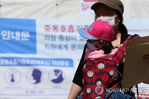 | △ 연건동 서울대학교병원 응급실 입구에 설치된 메르스 의심환자 격리센터(의심증상 검사 및 임시 수용시설) 앞에서 한 시민이 마스크를 쓴 채 아이를 안고 어린이병동으로 걸어가고 있다. (연합뉴스 자료사진) |