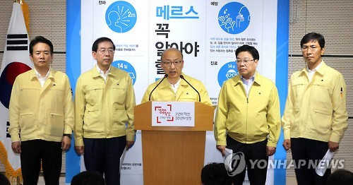 | △ 메르스 대응 정부-지자체 합의사항 발표 (세종=연합뉴스) 배재만 기자 = 문형표 보건복지부 장관이 7일 오후 정부세종청사 보건복지부 공용브리핑룸에서 '중앙 정부와 지자체 간 메르스 총력 대응을 위한 협력 합의사항'을 발표하고 있다. 왼쪽부터 안희정 충남도지사, 박원순 서울시장, 문 장관, 권선택 대전시장, 남경필 경기도지사. 2015.6.7 scoop@yna.co.kr http://blog.yonhapnews.co.kr/f6464 |