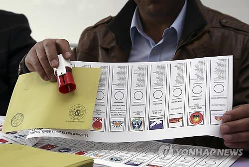 | △ (앙카라 AP=연합뉴스) 터키의 새 정부 선출 총선 투표일인 7일 오전(현지시간) 앙카라의 한 투표소에서 선관위 직원이 투표용지와 스탬프 등을 준비하고 있다. |