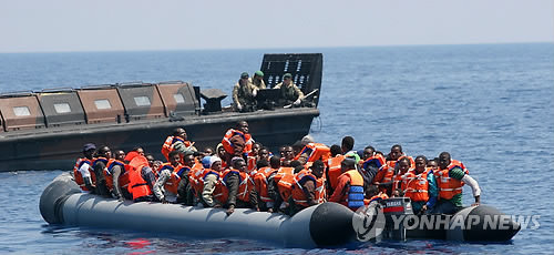 | △ 伊 지자체는 '거절'하겠다는데… (지중해 해상 AP/영국 해군=연합뉴스) 지중해 난민 구조활동에 참여 중인 영국 해병대가 7일(현지시간) 난민들을 상륙용 주정에 옮겨 태울 준비를 하고 있다. 주말 다국적 구조선들이 지중해에서 난민 약 6천명을 추가 구조한 가운데 최근 지방선거에 反난민 공약으로 기세를 올린 이탈리아 극우파 정당 북부리그와 중도우파 포르차 이탈리아(FI)당은 정부의 난민 수용 방침을 강력하게 비난했다. 이와 관련 이날 북부의 롬바르디아주, 베네토주, 리구리아주는 마테오 렌치 중도좌파 정부에 맞서 새로 도착하는 난민의 수용을 거절할 방침을 분명히 했다. bulls@yna.co.kr |