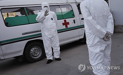 | △ 북한, '에볼라 방문금지' 6개월 만에 다시 관광객에 손짓 (평양 AP=연합뉴스) 지난해 10월 27일 평양 순안국제공항의 모습. 방호복을 입은 의료진이 앰뷸런스 옆에서 대기하고 있다. 아시아 어느 지역에서도 에볼라 전염이 보고되지 않았는데도 외국인 방문을 금지했던 북한은 6개월 만에 다시 외국인 관광을 재개했다. |