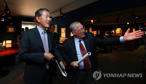 | △ 미2사단 찾은 허창수 전경련 회장 (의정부=연합뉴스) 임병식 기자 = 허창수 전국경제인연합회 회장이 9일 오후 경기도 의정부시 캠프 레드클라우드 미2사단 박물관에서 윌리엄 알렉산더 박물관장의 안내를 받고 있다. 이날 전경련은 한국 배치 50주년을 맞는 미2사단을 격려 방문해 미2사단 전우회 방한 사업에 5만 달러를 후원하기로 했다. 2015.6.9 andphotodo@yna.co.kr |