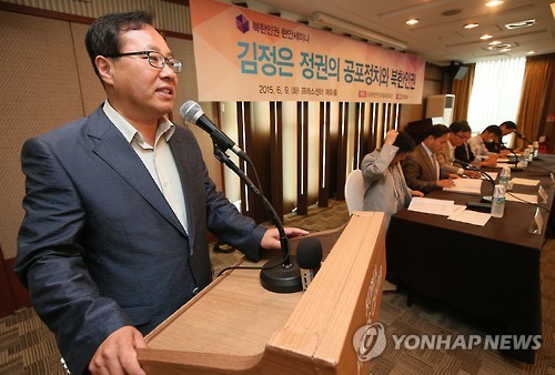 | △ 인사말 하는 한기홍 북한민주화네트워크 대표 (서울=연합뉴스) 박지호 기자 = 9일 오후 서울 태평로 프레스센터에서 열린 '김정은 정권의 공포정치와 북한인권' 세미나에서 한기홍 북한민주화네트워크 대표가 인사말을 하고 있다. 2015.6.9 jihopark@yna.co.kr |