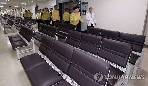 | △ 텅빈 병원 (대전=연합뉴스) 배재만 기자 = 최경환 국무총리 직무대행이 9일 오전 대전 건양대학교병원을 방문, 현장을 둘러본 후 의료진들과 함께 중동호흡기증후군(메르스) 대응 관련 간담회를 열기 위해 이동하고 있다. 이날 병원엔 메르스 여파로 내원객이 거의 없어 썰렁한 모습이었다. |
