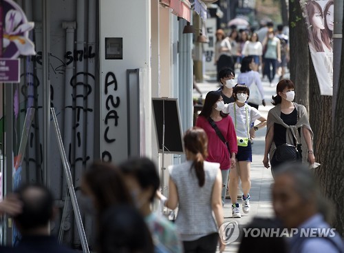| △ 마스크 착용한 관광객 (서울=연합뉴스) 윤동진 기자 = 중동호흡기증후군(메르스)이 확산돼고 있는 9일 오후 서울 강남구 신사동 가로수길에서 관광객들이 마스크를 쓴 채 걸어가고 있다. |