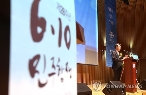 (서울=연합뉴스) 황희경 기자 = 행정자치부는 10일 오전 10시 서울시청에서 정종섭 행자부 장관과 박상증 민주화운동기념사업회 이사장 등 300여명이 참석한 가운데 제28주년 6·10 민주항쟁 기념식을 열었다.