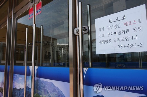 | △ "메르스 번질라" 문닫은 옥천문화예술회관 (옥천=연합뉴스) 박병기 기자 = 10일 충북 옥천군 문화예술회관의 굳게 닫힌 출입문에 임시휴관을 알리는 안내문이 내걸려 있다. 옥천군은 관내서 메르스 환자가 발생하자 다중집합시설을 모두 폐쇄했다. 2015.6.10 bgipark@yna.co.kr |
