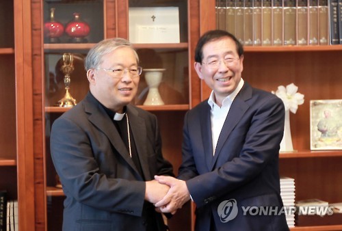 (서울=연합뉴스) 김희선 기자 = 천주교 서울대교구장인 염수정 추기경이 10일 오후 박원순 서울시장의 예방을 받고 남북교류협력사업 공동 추진에 합의했다고 서울대교구가 전했다.