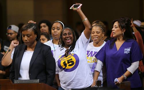 (로스앤젤레스=연합뉴스) 김종우 특파원 = 미국 LA 시의회가 10일(현지시간) 2020년까지 시간당 최저임금을 차례로 15달러(1만6천600원)까지 인상하는 최저임금 인상안을 최종 승인했다.