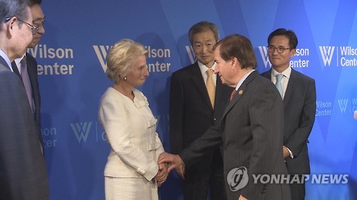 | △ 우드로윌슨센터에 '한국센터' 발족…현대차·KF 300만달러 투입 (워싱턴=연합뉴스) 노효동 특파원 = 10일(현지시간) 오후 미국 워싱턴의 우드로윌슨센터에서 현대자동차(주)와 한국국제교류재단의 후원을 받은 '현대차-KF 한국역사 및 공공정책 연구센터'가 발족됐다. 사진은 에드 로이스(공화·캘리포니아) 하원 외교위원장이 이날 행사가 끝난 뒤 제인 하먼 우드로윌슨센터 소장, 안호영 주미 한국대사, 이광국 현대차 워싱턴사무소장, 유현석 KF 이사장 등과 만나 악수를 나누는 모습. |