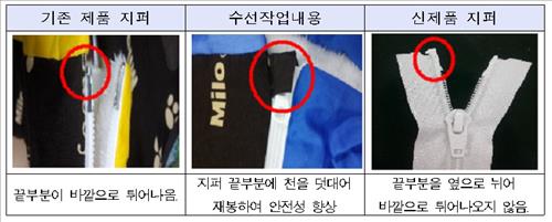 조사 결과 어린이가 누웠을 때 얼굴이 놓이는 위치에 금속제 지퍼 끝부분이 날카롭게 튀어나와 있어 어린이가 잠을 자며 뒤척이다 얼굴에 닿으면 상처가 날 우려가 있는 것으로 확인됐다.