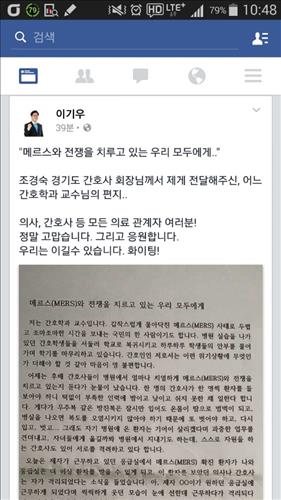 이기우 사회통합부지사는 "의사, 간호사 등 모든 의료 관계자 여러분, 정말 고맙습니다. 그리고 응원합니다. 우리는 이길 수 있습니다. 화이팅"이란 글로 메르스와 사투를 벌이는 의료진을 응원했다.