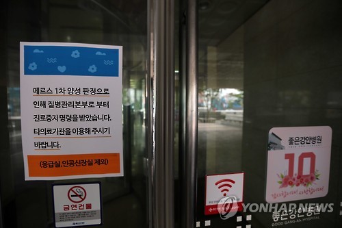 | △ (부산=연합뉴스) 조정호 기자 = 부산에서 확인된 중동호흡기증후군(메르스) 확진자 이모(31)씨가 입원치료를 받은 부산 좋은강안병원 입구에 13일 질병관리본부가 이 병원에 대해 진료중지명령(응급실, 인공신장실 제외)을 내렸다는 안내문이 붙었다. 보건당국이 부산지역 병원 3곳과 이씨의 근무지를 확인해보니 현재까지 이씨와 접촉한 사람이 717명에 달하는 것으로 나타났다. 2015.6.13 ccho@yna.co.kr |