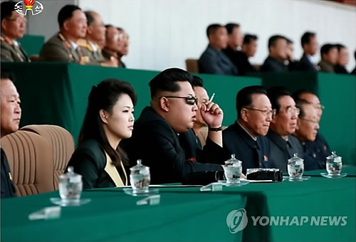 | △ 북한 김정은 국방위원회 제1위원장이 지난 4월 13일 부인 리설주와 함께 김일성경기장에서 진행된 남자축구경기를 보며 담배를 피우는 모습으로 노동신문이 보도했다. 김 제1위원장은 공개 석상에서 자주 흡연하는 모습이 포착돼 '애연가'로 알려졌다. 2015.6.13.<<연합뉴스DB>> |