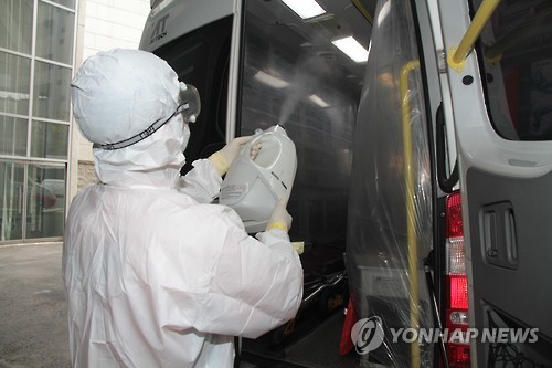 | △ 구급차량 소독하는 구급대원 (서울=연합뉴스) 11일 서울 중부소방서에서 구급대원이 메르스 확산 방지를 위해 구급차량을 소독하고 있다. 2015.6.11 << 중부소방서 제공 >> photo@yna.co.kr |