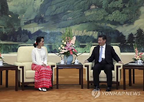 | △ (베이징 AP=연합뉴스) 미얀마 민주화 운동의 상징인 아웅산 수치 여사가 11일 중국 베이징 인민대회당에서 시진핑 중국 국가주석과 만나고 있다. |