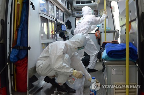 | △ 구급차 소독하는 소방대원들 (서울=연합뉴스) 중동호흡기증후군(메르스) 감염 방지 교육을 받은 소방대원들이 2일 서울 영등포소방서에서 구급차 소독을 하고 있다. 2015.6.2 << 영등포소방서 제공 >> photo@yna.co.kr |