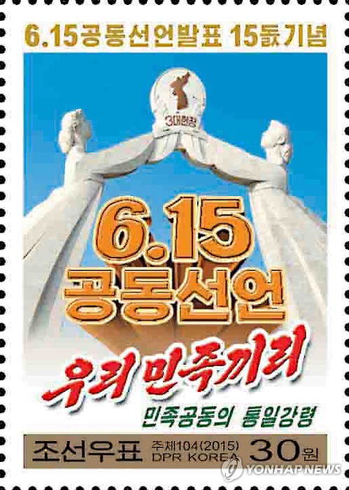 | △ 북한 6.15공동선언 기념 우표 (평양 조선중앙통신 = 연합뉴스) 6.15공동선언발표 15주년을 맞아 북한 국가우표발행국에서는 기념우표(개별우표 1종)를 내놓았다고 조선중앙통신이 14일 보도했다. 2015.6.14 photo@yna.co.kr |