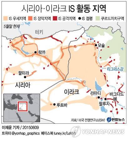 100개국의 지하디스트 2만여명을 모은 IS는 시리아 동부와 이라크 서부를 중심으로 점령지를 늘렸다. IS는 지난달 시리아 정부군으로부터 마지막 남은 시리아-이라크 국경 검문소를 빼앗아 지도에서 국경선을 지워버렸다.