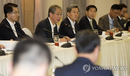 | △ 모두발언하는 임종룡 위원장 (서울=연합뉴스) 윤동진 기자 = 임종룡 금융위원회 위원장(왼쪽 두 번째)이 15일 오전 서울 중구 프레스센터에서 열린 금융규제개혁 추진회의에서 모두발언을 하고 있다. 이날 열린 회의에서 임 위원장은 "법령, 감독규정, 시행세칙 등 명시적 규제뿐 아니라 행정지도, 모범규준, 가이드라인 등 소위 '그림자규제'도 전수조사할 것"이라고 밝혔다. |