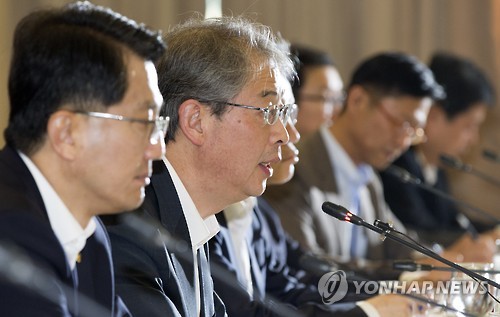 | △ 금융규제개혁 추진회의 (서울=연합뉴스) 윤동진 기자 = 임종룡 금융위원회 위원장(왼쪽 두 번째)이 15일 오전 서울 중구 프레스센터에서 열린 금융규제개혁 추진회의에서 모두발언을 하고 있다. 이날 열린 회의에서 임 위원장은 "법령, 감독규정, 시행세칙 등 명시적 규제뿐 아니라 행정지도, 모범규준, 가이드라인 등 소위 '그림자규제'도 전수조사할 것"이라고 밝혔다. |