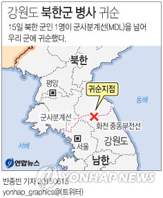 (서울=연합뉴스) 김귀근 이영재 기자 = 북한군 병사(하전사) 1명이 15일 비무장지대(DMZ)내 소초(GP)를 통해 우리 군에 귀순했다.