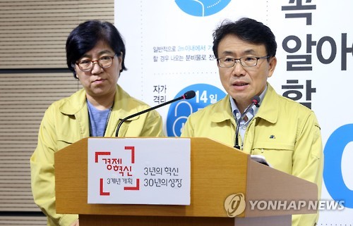 | △ 권덕철 총괄반장, '메르스는' (세종=연합뉴스) 배재만 기자 = 권덕철 중앙메르스관리대책본부 총괄반장이 15일 오전 정부세종청사 보건복지부 공용브리핑룸에서 열린 중동호흡기증후군(메르스) 정례 브리핑에서 기자들의 질문에 답하고 있다. 왼쪽은 정은경 현장점검반장. scoop@yna.co.kr http://blog.yonhapnews.co.kr/f6464 |