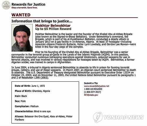 (서울=연합뉴스) 김선한 기자 = 지난 2013년 1월 알제리 천연가스 시설에서 발생한 대규모 인질극의 주범으로 지목된 국제 테러 조직 알카에다의 '거물' 모크타르 벨모크타르가 13일(현지시간) 리비아에서 미군 공습에 사망한 것을 둘러싸고 미군의 테러 용의자제거 작전에 대한 관심이 높다.