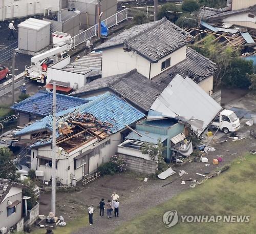 | △ 15일 오후 일본 군마(群馬)현 이세사키시의 주택 지붕이 심하게 파손돼 있다. (교도=연합뉴스) |