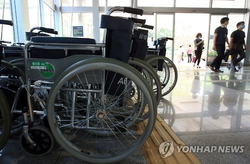 | △ 14번 환자 휠체어로 응급실 밖 이동 (서울=연합뉴스) 홍해인 기자 = 60명을 감염시키며 중동호흡기증후군(메르스) '슈퍼전파자'로 알려진 14번 환자가 삼성서울병원에서 휠체어로 응급실 밖으로도 이동한 것으로 확인된 12일 서울 일원동 삼성서울병원 로비의 휠체어 보관소 앞으로 내원객들이 오가고 있다. 2015.6.12 hihong@yna.co.kr |