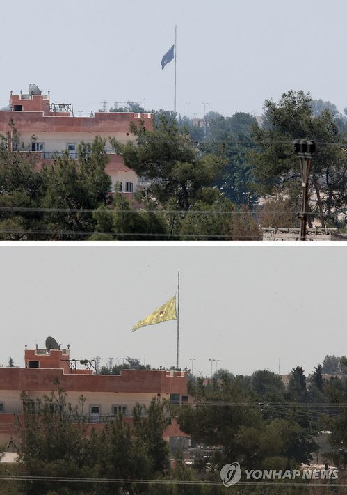 | △ 2시간 뒤 바뀐 깃발…IS 격퇴당해 (악차칼레<터키> AP=연합뉴스) 터키 남동부의 시리아와 국경지대 아카칼레에서 바라본 시리아 쪽 탈아비야드. 한 건물에 이슬람 무장단체 이슬람국가(IS) 깃발이 내걸려 있다가(위쪽 사진) 두 시간 뒤 쿠르드족 민병대인 인민수비대(YPG) 깃발(아래 사진)로 바뀌었다. ciy@yna.co.kr |