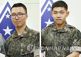| △ 육군, 올들어 '최전방 수호병' 6천명 선발 (서울=연합뉴스) 이영재 기자 = 육군이 올해 들어 일반전초(GOP)를 비롯한 최전방 부대에 배치하는 우수 병사인 '분·소대 전투병'이 6천명에 가까운 것으로 나타났다. 분·소대 전투병의 명칭은 '최전방 수호병'으로 바뀌게 된다. 22사단 56연대 2중대 김병윤 일병(왼쪽)이 최전방 수호병사라는 명칭을 응모해 최우수상을 받았고, 22사단 55연대 1대대 손주환 병장은 호랑이를 그린 최전방 수호병의 명예휘장을 공모해 최우수상을 받았다. 2015.6.17 << 육군 >> ljglory@yna.co.kr |