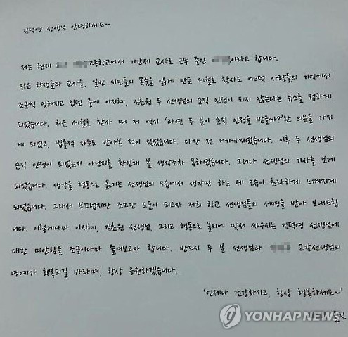 | △ "단원고 희생 기간제 교사와 교감 (안산=연합뉴스) 17일 '세월호 참사 희생교사 동료들의 서명운동본부'에 따르면 세월호 사고로 희생한 김초원(당시 26세)·이지혜 교사(당시 31세)와 스스로 목숨을 끊은 강모(당시 53세) 단원고 전 교감의 순직인정 서명운동에 5천8명이 동참했다. 사진은 서명지와 함께 온 한 교사의 응원 편지. 2015.6.17 <<서명운동본부 제공>> young862yna.co.kr |