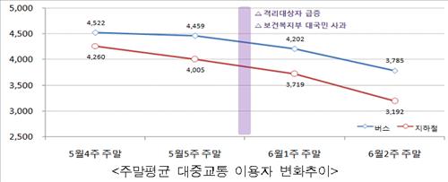 15일 대중교통 승객은 1천81만 8천명으로 5월 다섯째주 평일 평균보다 182만명, 약 14.4% 감소했다.