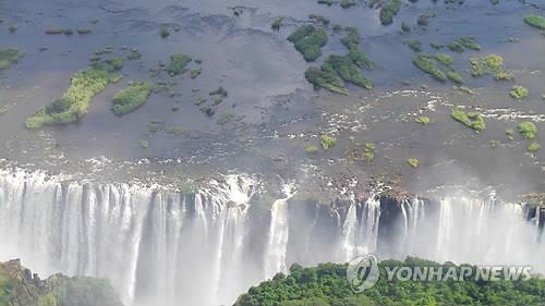 | △ 하늘에서 본 빅토리아 폭포 (빅토리아 폭포<짐바브웨>=연합뉴스) 류일형 특파원 = 25일 짐바브웨의 잠베지강을 따라 느릿느릿 내려오던 강물이 빅토리아 폭포 천 길 낭떠러지를 만나 시원스럽게 자유낙하하고 있다. 2015.2.25 ryu625@yna.co.kr |