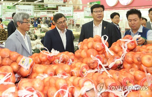| △ 가뭄동향 및 농산물 수급동향 점검 (서울=연합뉴스) 임헌정 기자 = 주형환 기획재정부 제1차관(왼쪽 세번째)이 17일 서울 양재동 농협하나로클럽에서 가뭄 동향 및 농산물 수급동향 점검을 하며 양파를 살펴보고 있다. 2015.6.17 kane@yna.co.kr |