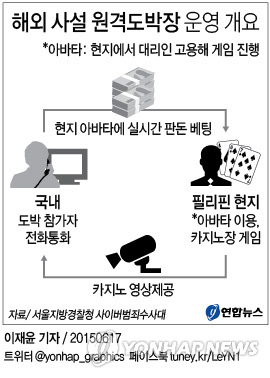 모집된 국내 도박 참가자들이 사설도박장에서 필리핀 카지노의 영상을 보며 전화로 3천∼150만 페소(약 7만5천~3천750만원)를 판돈으로 걸면 현지 테이블에 앉아 있는 '아바타'들이 대신 돈을 걸고 게임을 진행했다.