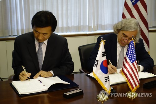 | △ 개정 한미 원자력협정에 서명하는 윤병세 외교장관 (워싱턴=연합뉴스) 김세진 특파원 = 윤병세 외교장관(왼쪽)과 어니스트 모니즈 미국 에너지부 장관이 15일(현지시간) 미국 워싱턴DC 에너지부 본부에서 개정된 한미 원자력협정문에 서명하고 있다. |