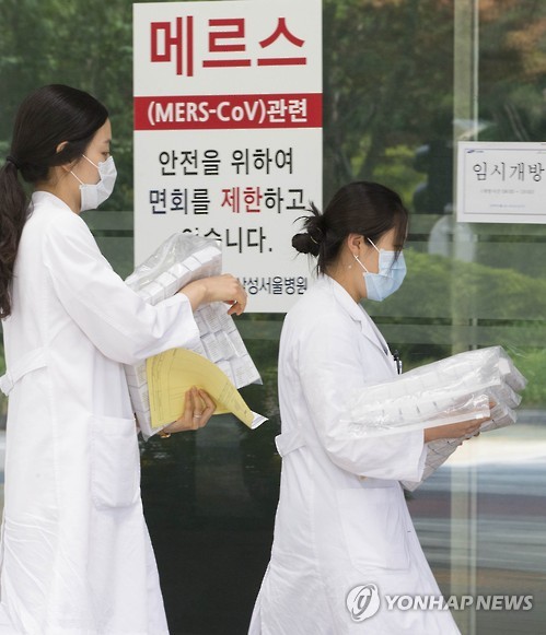 | △ '안전을 위해 면회를 제한합니다' (서울=연합뉴스) 윤동진 기자 = 16일 중동호흡기증후군(메르스) 확산 여파로 부분적인 병원 폐쇄조치가 내려진 강남구 삼성서울병원에 면회 제한 관련 안내문이 붙어 있다. 2015.6.16 mon@yna.co.kr |