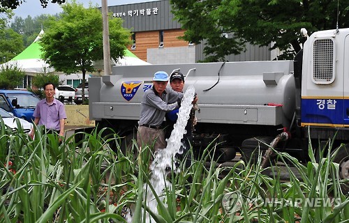 | △ 경찰 시위진압용 물 보급차도 가뭄 지원 (춘천=연합뉴스) 유례없는 극심한 가뭄에 경찰의 시위진압용 물 보급차량 12대가 강원도 내 농촌지역 급수지원에 나선 가운데 16일 영월군의 한 농가에 투입된 물 보급차량이 밭에 물을 공급하고 있다. (강원지방경찰청 제공) |