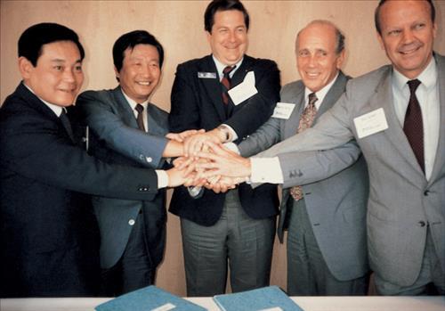 | △ 1985년 6월 이건희 삼성그룹 회장(당시 부회장)과 UTC그룹(P&W최대주주) 그레이 회장이 참석한 가운데 프랑스 파리에어쇼 현장에서 PW4000 엔진 국제공동개발사업(RSP)에 대한 양사간 협력 합의가 이루어졌다 |