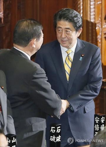 | △ 2014년 11월 21일 오후 일본 국회의사당에서 당시 이부키 분메이(伊吹文明) 중의원 의장의 해산 조서 낭독으로 중의원이 해산되자 이를 지켜보던 아베 신조(安倍晋三·오른쪽) 일본 총리가 이시바 시게루(石破茂) 지방창생 담당상과 악수하고 있다.(교도=연합뉴스) |