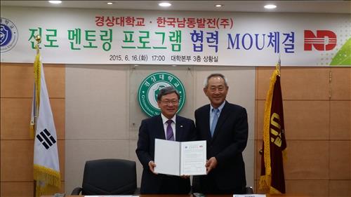 (서울=연합뉴스) 이봉준 기자 = 한국남동발전은 16일 경남 진주시 경상대학교 대학본부에서 경상대 측과 대학생들의 성장과 발전을 위한 '대학생 진로 멘토링' 협약을 맺었다.