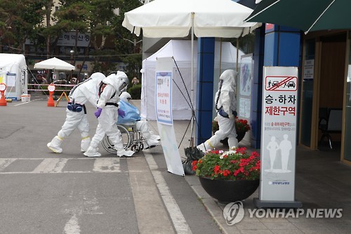 | △ 대구 메르스 환자 경북대병원 이송 (대구=연합뉴스) 대구 첫 중동호흡기증후군(메르스) 확진 환자인 공무원 A(52)씨가 집중치료를 받기 위해 17일 오후 대구의료원에서 경북대병원으로 이송됐다. 2015.6.17 << 경북대병원 >> mshan@yna.co.kr |