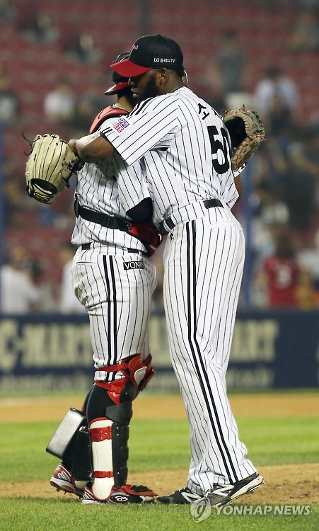 | △ '수고했어 오늘도' (서울=연합뉴스) 박동주 기자 = 17일 서울 잠실야구장에서 열린 프로야구 LG와 KIA의 경기. 완봉승을 거둔 LG 선발 소사가 포수 유강남과 기쁨을 나누고 있다. 2015.6.17 pdj6635@yna.co.kr |