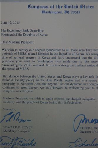 (워싱턴=연합뉴스) 심인성 특파원 = 미국 하원의원 38명이 17일(현지시간) 박근혜 대통령 앞으로 초당적인 연명서한을 보내 중동호흡기증후군(메르스) 사태에 대한 깊은 위로를 전하면서 조기 극복을 기원했다.