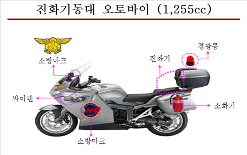 이륜차는 자동변속방식, 배기량 1천255cc의 스쿠터형으로 2.5kg의 분말소화기, 관창, 수관 등 4가지 종류의 진압장비 5점을 갖췄다. 휴대용 방수총, 에어실린더, 약제탱크로 구성된 진화기도 포함됐다.